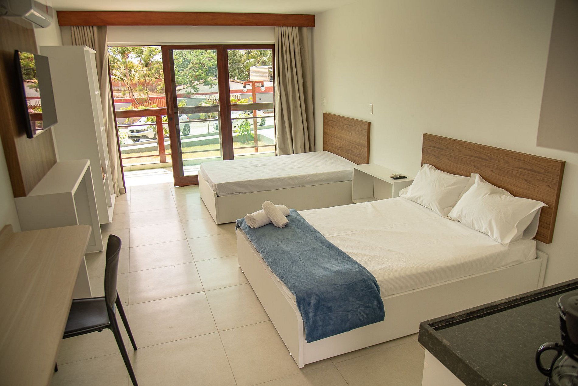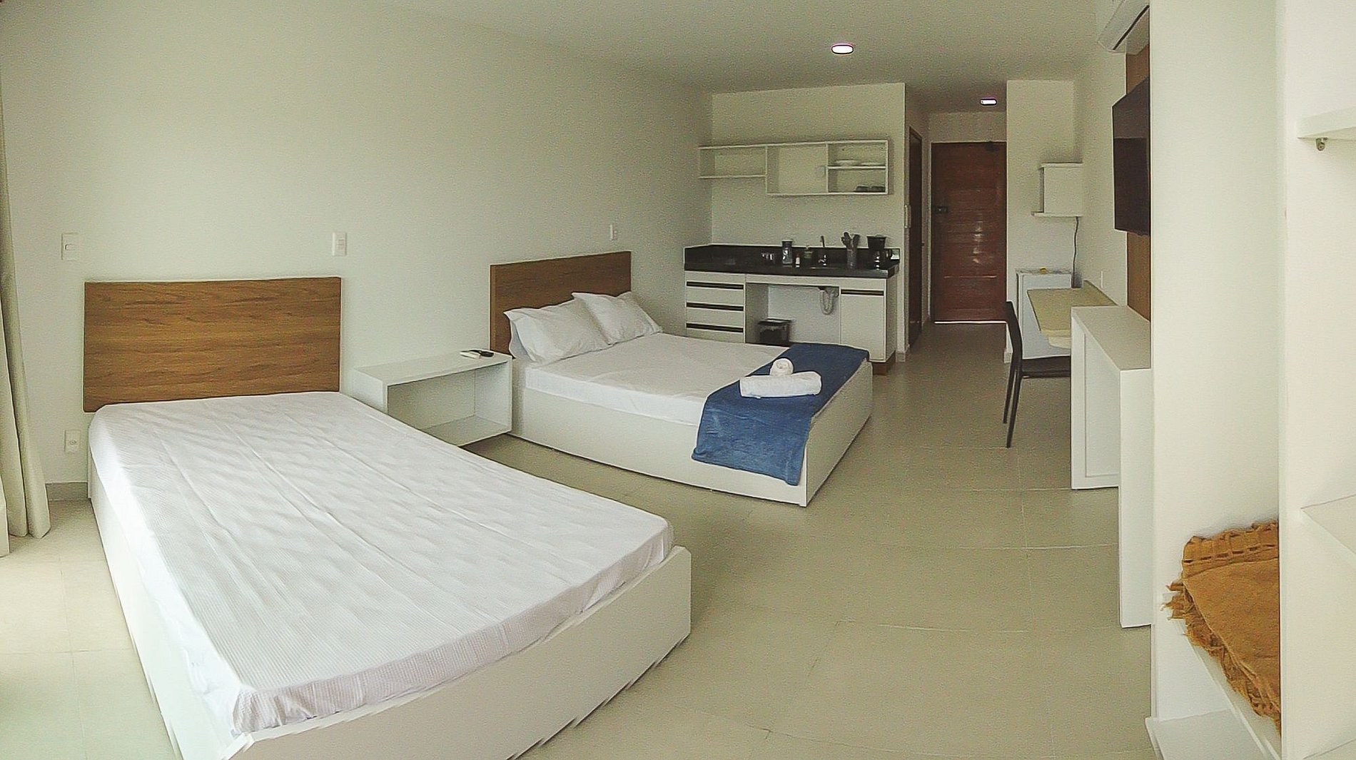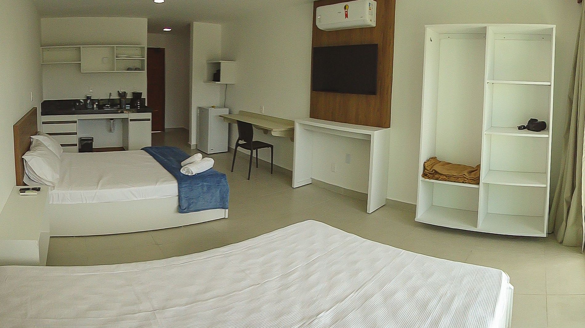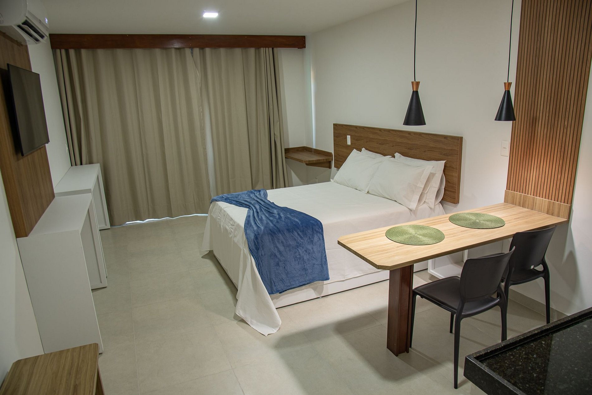 Buscando elevar ao máximo o nível de conforto para os hóspedes, especialmente para aqueles que buscam maiores períodos, foram aplicados materiais e equipamentos de excelente qualidade. Destacando piso porcelanato, madeiramento em jatobá e maçaranduba, SmartTV de 43" 4K, ar condicionado inverter, enxoval (lençóis, colchas e fronhas) de linha hoteleira da tekka.