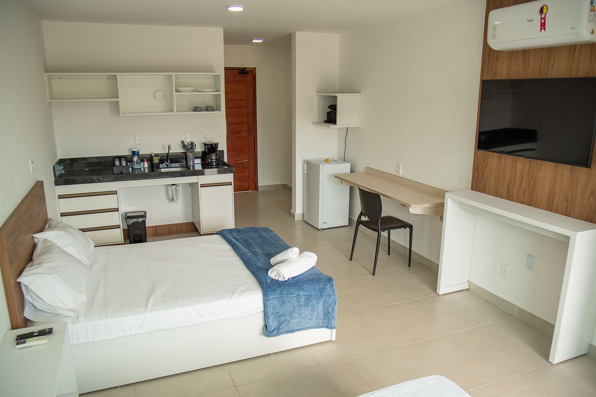 Empreendimento recém construído, possuí área de lazer com três piscinas, sendo uma adulto com hidromassagem, uma intermediária (55cm de profundidade) e outra para crianças (30cm de profundidade). Conta com recepção dotada de Smart TV, sofá, mesa de apoio e frigobar com água, refrigerante, suco e cervejas (consulte valores) para maior comodidade durante checkin e checkout. Os Flats possuem banheiro privativo, varanda, duas camas de casal, sendo um colchão casal tradicional - firme - molas ensacadas - e outro colchão de espuma - firme - 1,20m de largura. A cozinha conta com cooktop de indução, cafeteira, sanduicheira, cutelaria básica e frigobar.